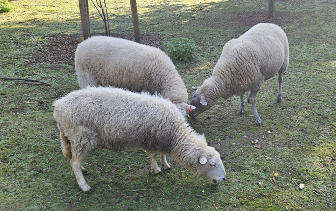 The sheep are trying to help by shoving their feet and noses under their fences to get their teeth into apple windfalls.